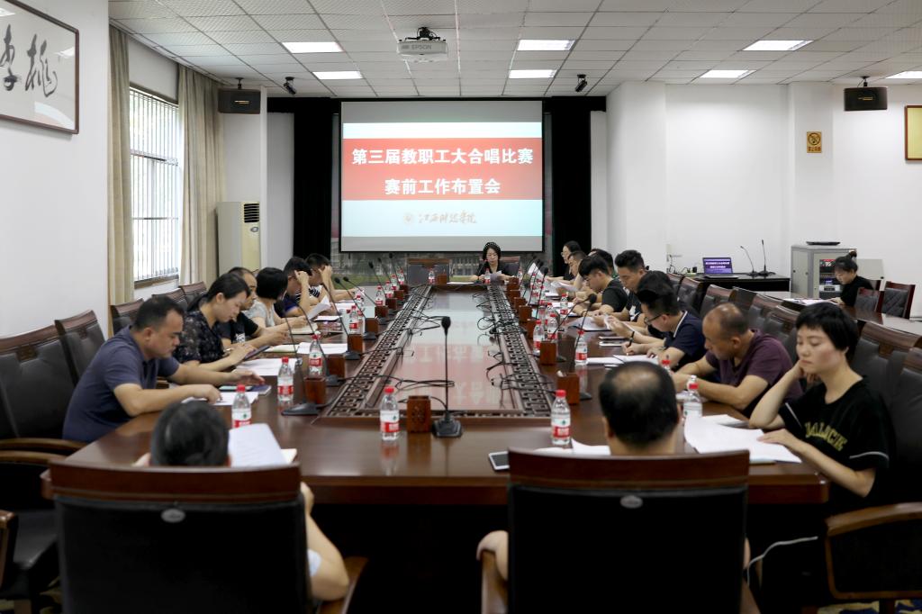 江科网讯(记者 何强江)为保证“我和我的祖国”庆祝新中国成立70周年——江西科技学院第三届教职工大合唱比赛顺利开展,9月17日上午,副校长、校工会主席林素君在行政北一楼会议室主持召开赛前工作布置会。