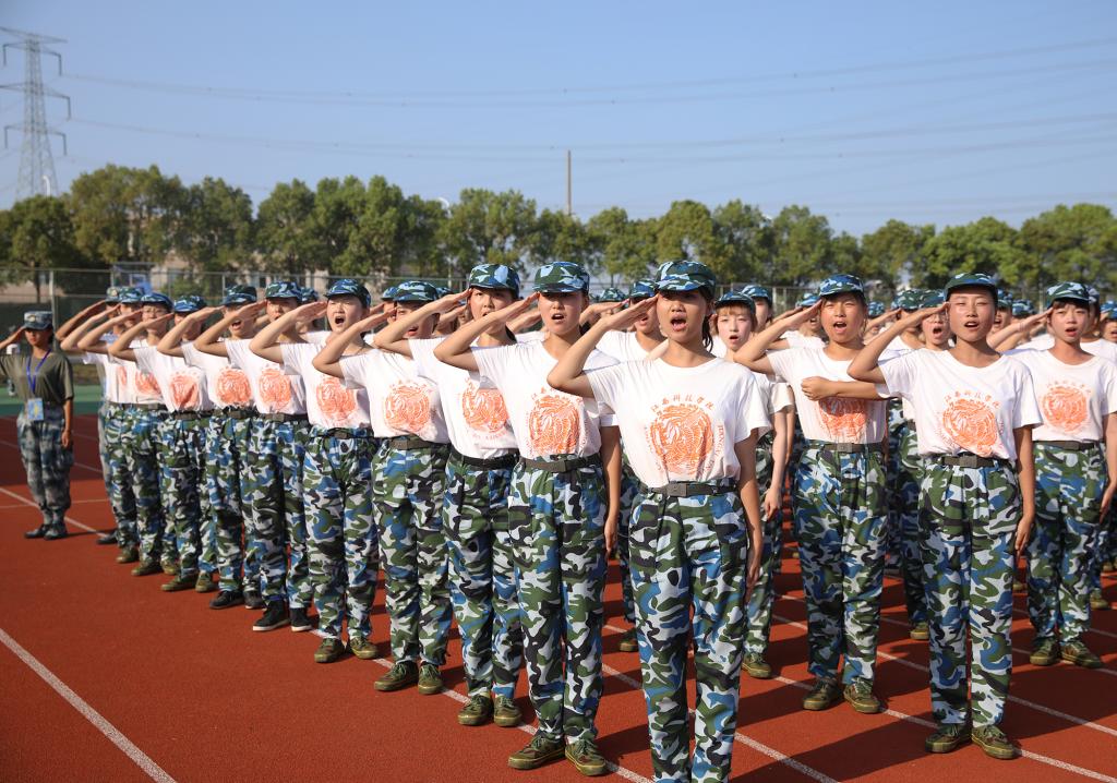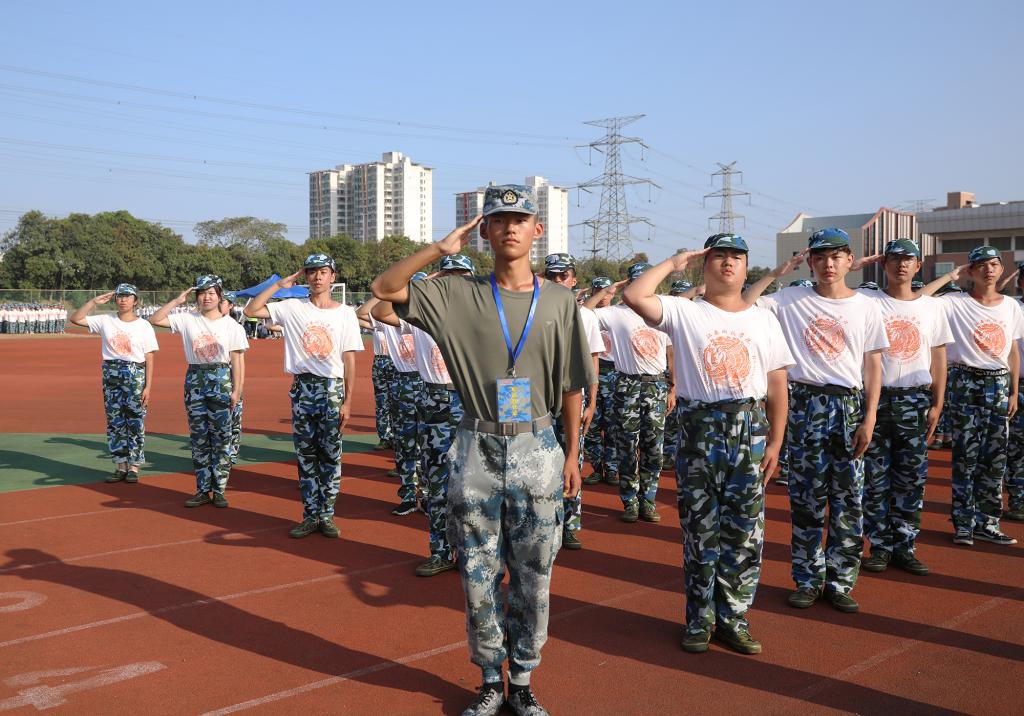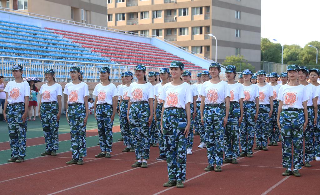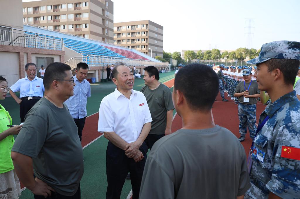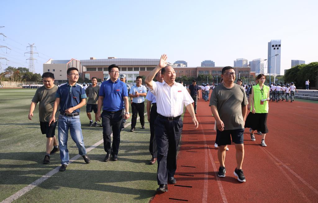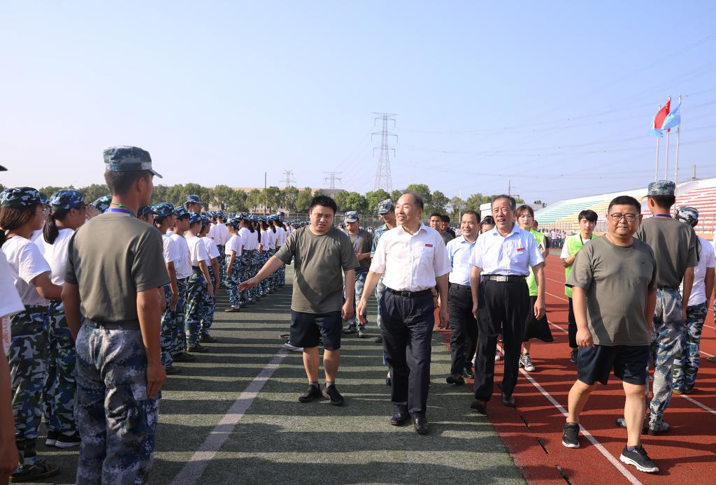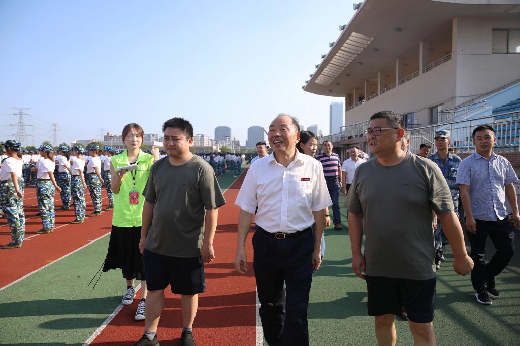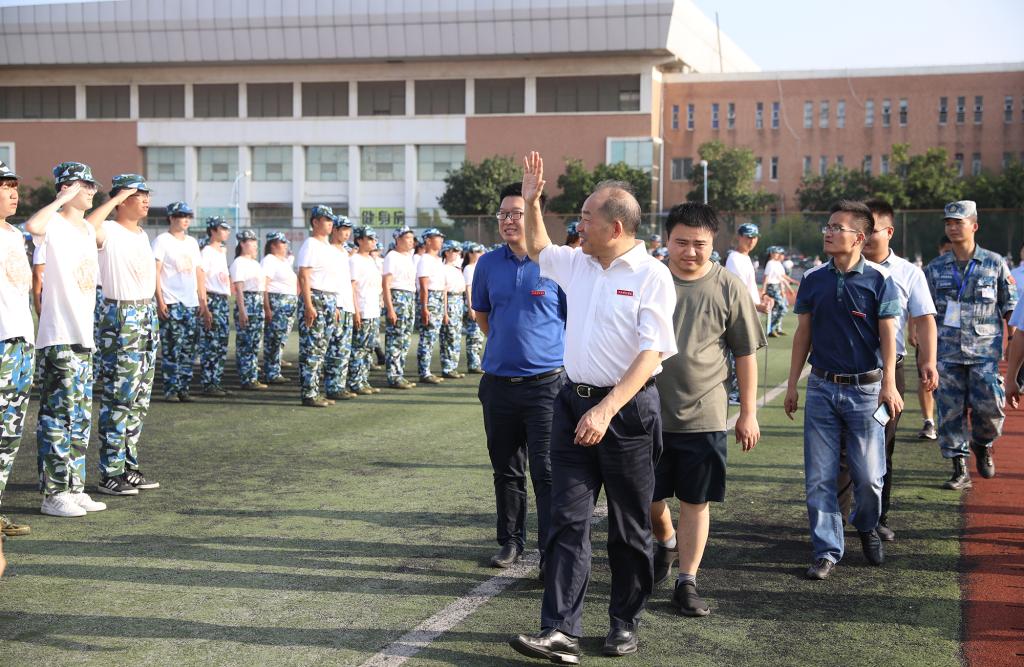 “书记好!书记好!书记好!”新生们嘹亮的口号响彻奥林匹克运动场。校领导肯定了参训学生的训练状态,并向大家挥手示意、致以问候。