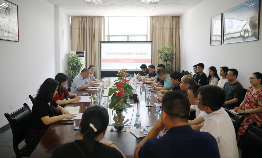 江科网讯 7月26日上午,2019年新生录取通知书首发仪式在招生就业处隆重举行。校长张海涛,校党委副书记、副校长闵桂林出席仪式。各学院学工副院长、招就处工作人员参加了仪式。