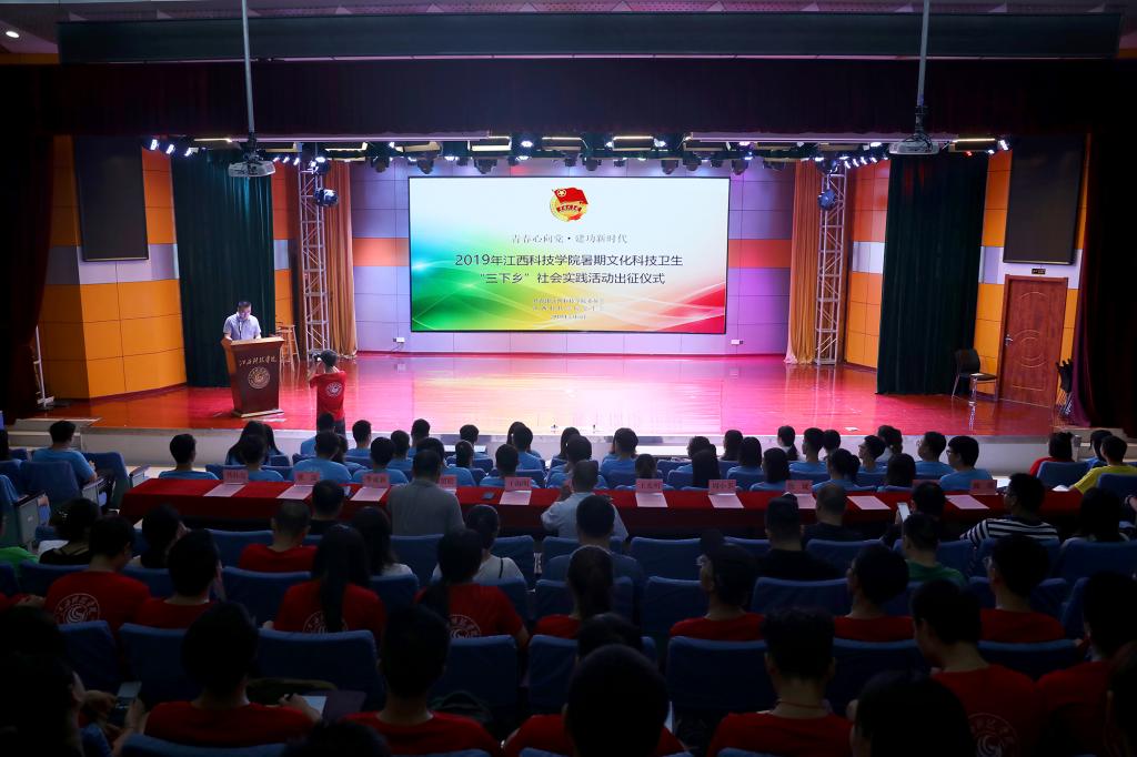 江科网讯(记者 何强江)7月5日上午,我校在报告C厅举行“青春心向党·建功新时代”2019年江西科技学院大学生志愿者暑期文化科技卫生“三下乡”社会实践活动出征仪式。校党委副书记、副校长闵桂林出席仪式。校团委相关负责同志,校学生会主席团成员,各学院党总支书记、团委书记、团委副书记、学生会主席,2019年暑期“三下乡”指导老师、志愿者等参加出征仪式。