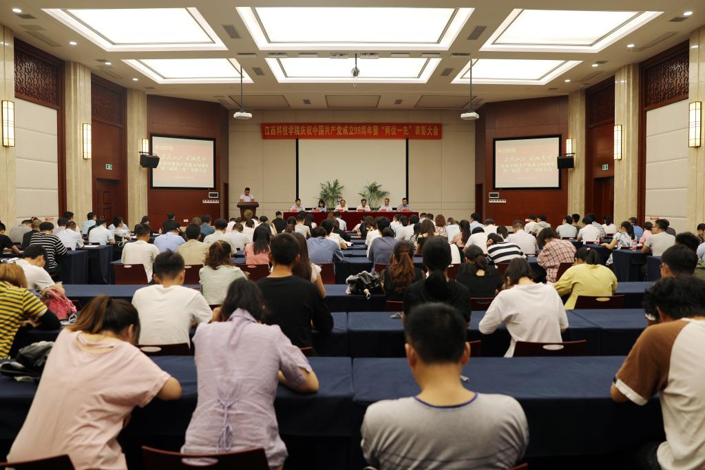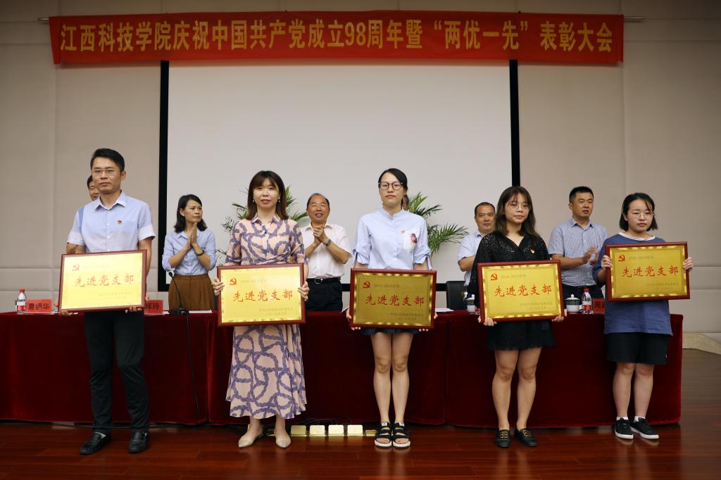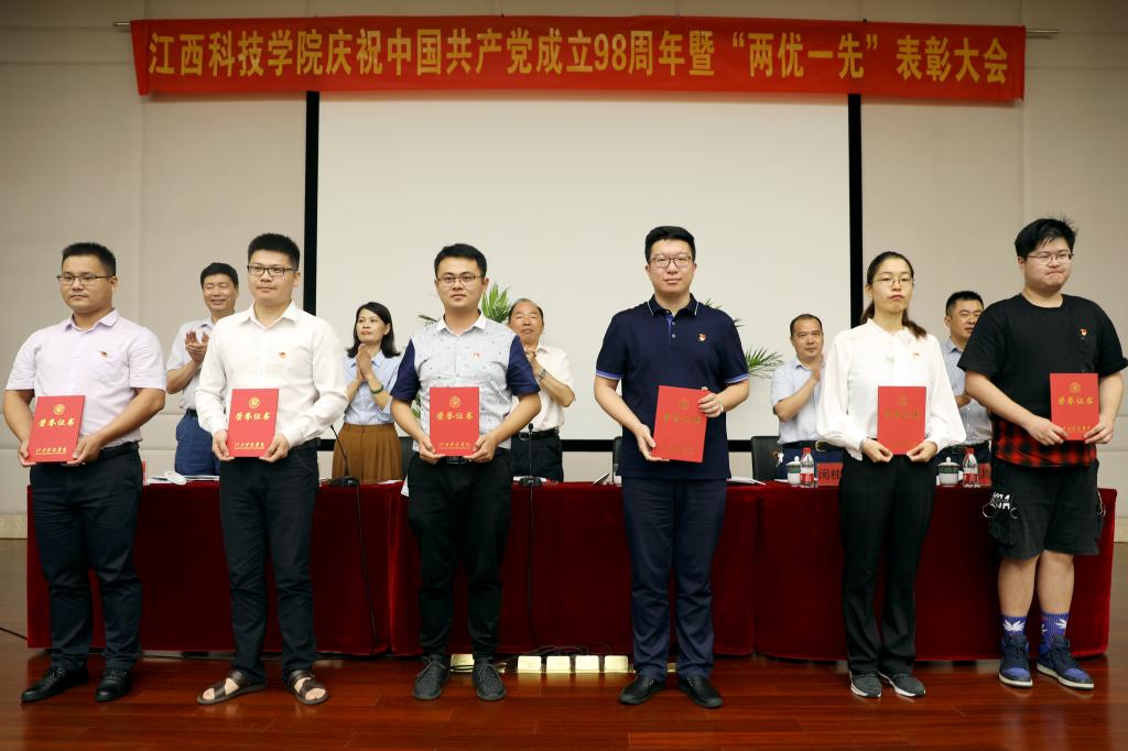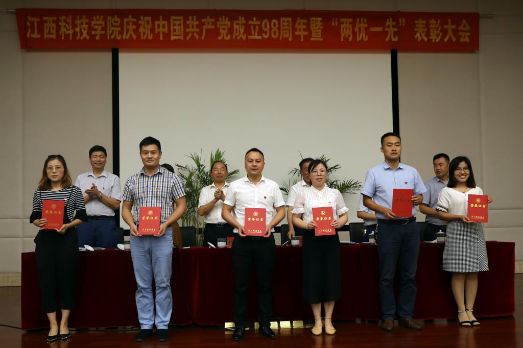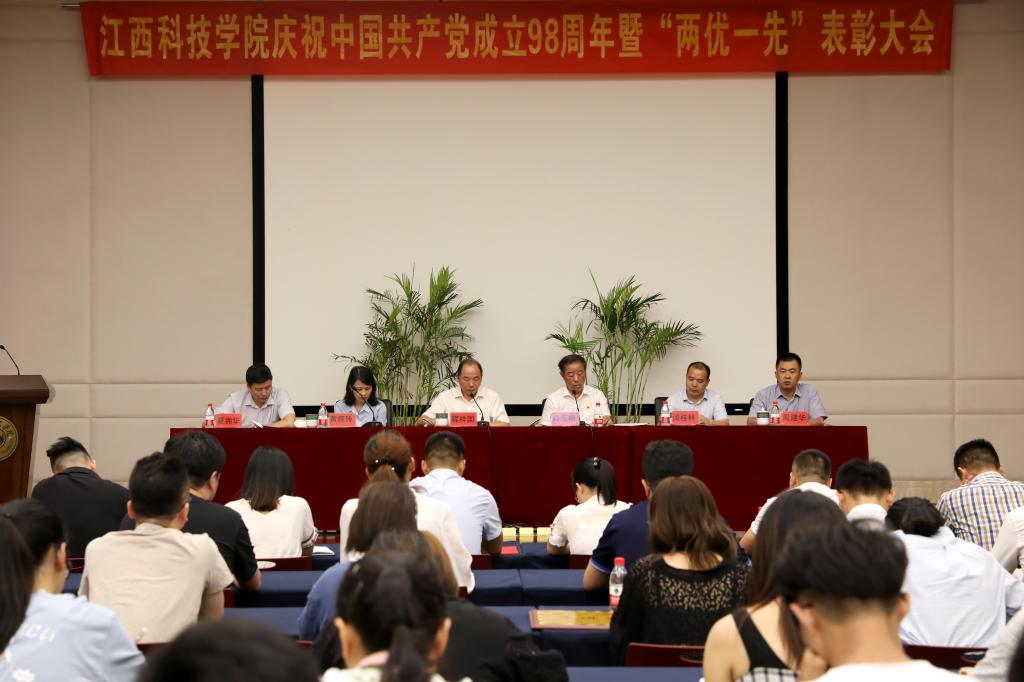 江科网讯(记者 何强江)7月1日上午,江西科技学院庆祝中国共产党成立98周年暨“两优一先”表彰大会在行政南一楼第一会议室隆重召开。校党委书记、督导专员程样国,党委副书记肖イ毛根,副书记、副校长、党校校长黄辉玲,副书记、副校长闵桂林出席。大会由肖イ毛根主持。