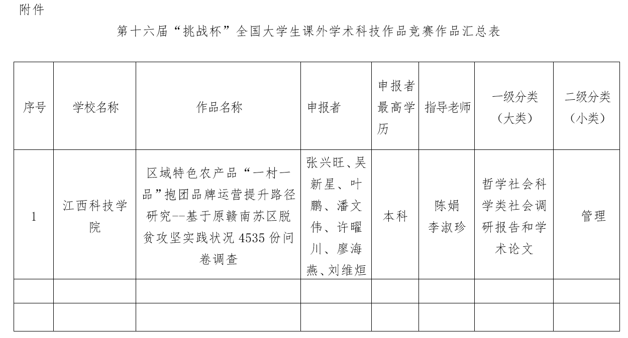 根据《关于第十六届“挑战杯”全国大学生课外学术科技作品竞赛江西省推报作品名单的通知》文件精神,经现场展示、评审间辩、评审会审定,我校一件作品参加第十六届“挑战杯”全国大学生课外学术科技作品竞赛。