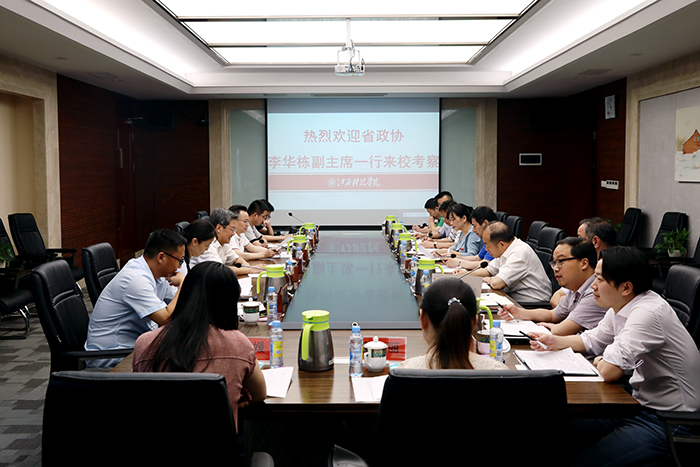 江科网讯(记者 何强江)5月29日下午,省政协副主席、九三学社江西省委员会主委李华栋,省政协副秘书长、九三学社江西省委员会专职副主委肖礼庆,省政协委员,九三学社江西省委员会副巡视员、秘书长田荣,九三学社江西省委员会组织部部长梁磊、办公室副主任周军、宣传部主任科员黄炎俊一行来校考察调研。李华栋一行与董事长于果、校党委书记程样国、校长张海涛、党委副书记肖イ毛根、副校长陈石俊等在行政南楼第三会议室座谈。参加座谈的还有党委委员、党(校)办主任、统战部部长周建华及九三学社江西科技学院支社社员代表。
