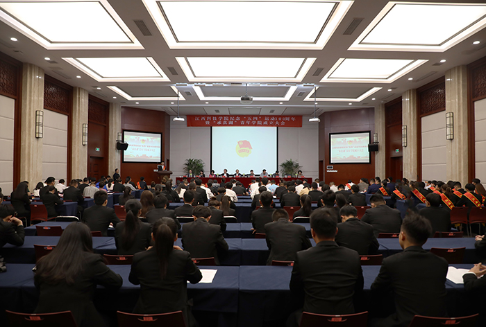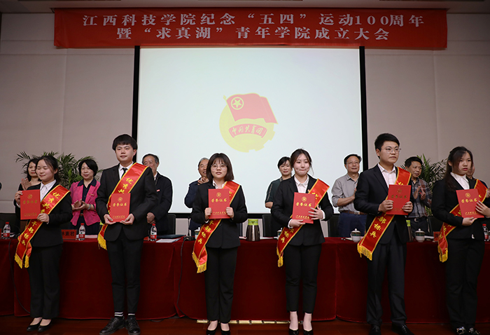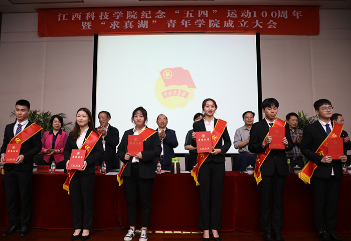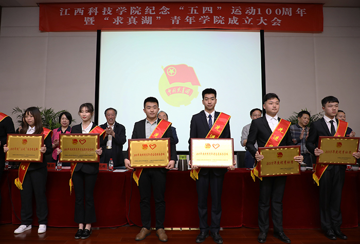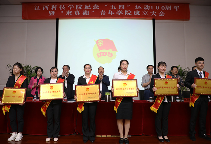 根宣读《关于表彰全校共青团系统2018年度先进集体和优秀个人的决定》。黄辉玲宣读《关于成立江西科技学院“求真湖”青年学院的通知》。与会领导为受表彰的集体和个人颁奖。