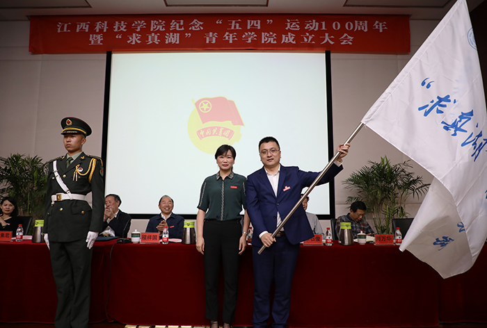 会上,张海涛为“求真湖”青年学院授旗。肖