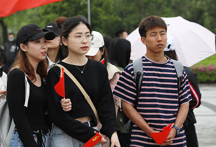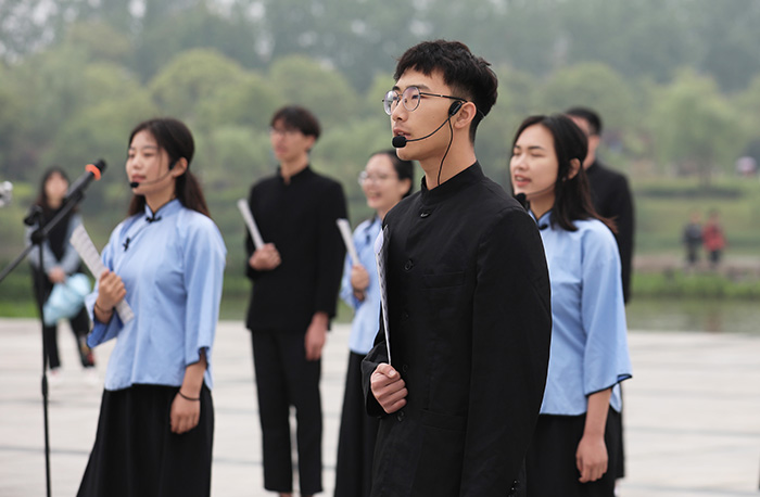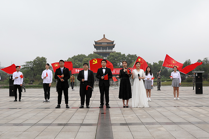 江科网讯(记者 李倩)“落霞与孤鹜齐飞,秋水共长天一色。渔舟唱晚,响穷彭蠡之滨;雁阵惊寒,声断衡阳之浦。”巍峨的蓝天阁下,微波粼粼的求真湖畔,江科学子抑扬顿挫的诵读声吸引众多师生驻足聆听。4月28日,“青春心向党,建功新时代——‘我和我的祖国’全民悦诵·江科人在行动”主题阅读快闪活动在临水广场举办,校党委书记程样国、副书记肖