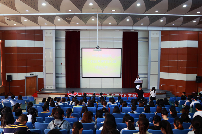 外语外贸学院院长胥懋云,副院长周家星、郭留松,考研辅导中心主任余美剑与该学院2019届考研毕业生,学院考研辅导班学员以及学生代表一道参会。周家星介绍了该院2019届毕业生考研整体情况,余美剑为同学们作考研寄语。考研学生代表上台分享了自己的考研经验。
