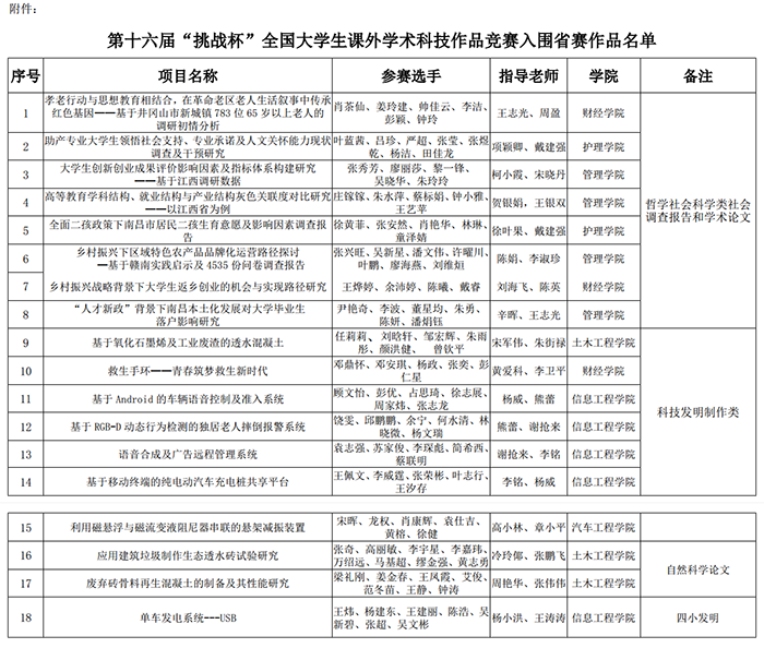 附件:第十六届“挑战杯”全国大学生课外学术科技作品竞赛入围省赛作品名单