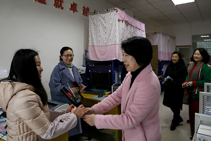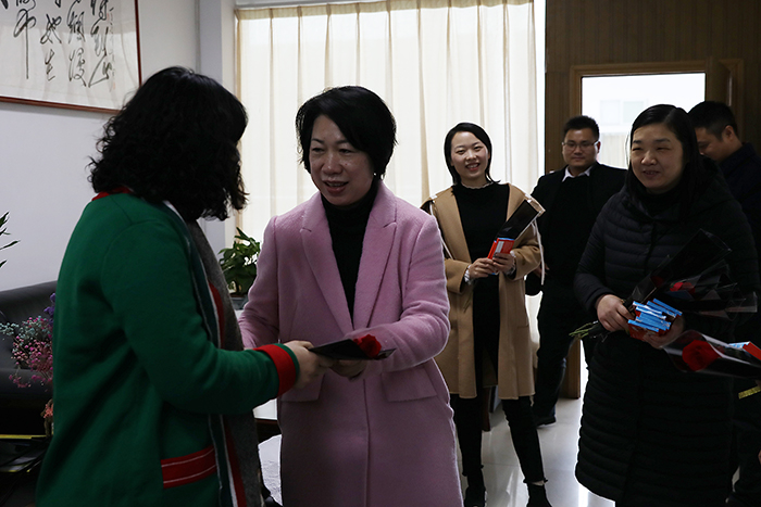 “三八节快乐,谢谢你为学校作出的贡献。”3月8日下午,副校长、工会主席林素君在工会办公室副主任刘国安和女工委员刘箫、肖爱武的陪同下,走访了图书馆、音乐舞蹈学院、宿三栋、招就处、教务处 等地,看望了“三•八”节依然坚持奋斗在工作一线的部分女职工,并送上了鲜花、巧克力和节日祝福。林素君在慰问期间,希望广大女教职工以更加饱满的精神和良好的状态在本职岗位上建功立业,书写“美丽人生”。收到祝福的女教职工们脸上洋溢着幸福快乐的笑容。