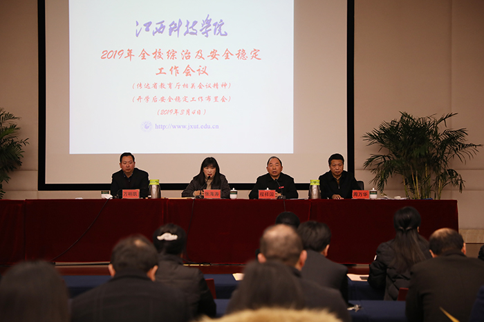 江科网讯(记者 何强江)3月4日上午,2019年全校综治及安全稳定工作会议在行政南一楼第一会议室召开。校党委书记程样国,校长张海涛,副校长周万华,副书记、副校长万哨凯出席。会议由张海涛主持。