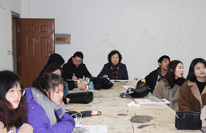 吴志国从写意山水画作欣赏入手,用生动幽默的语言向同学们讲解了写意山水画的特点及绘画的前期准备要求,逐步引导同学们了解写意山水,课堂气氛活跃。熊爱民凝神专注,认真记录,时刻关注同学们的听课状态。