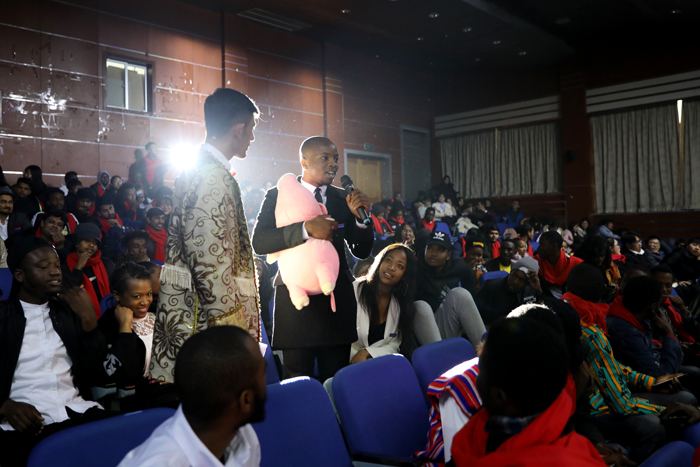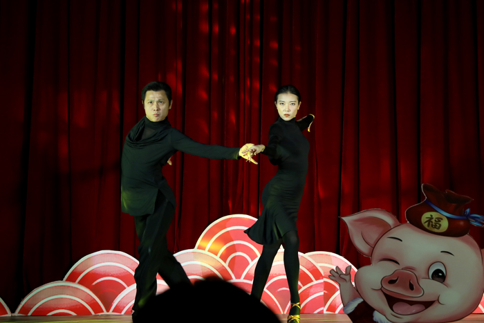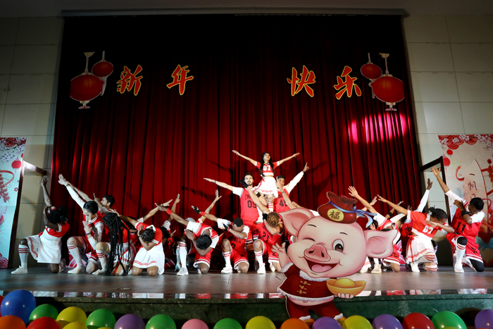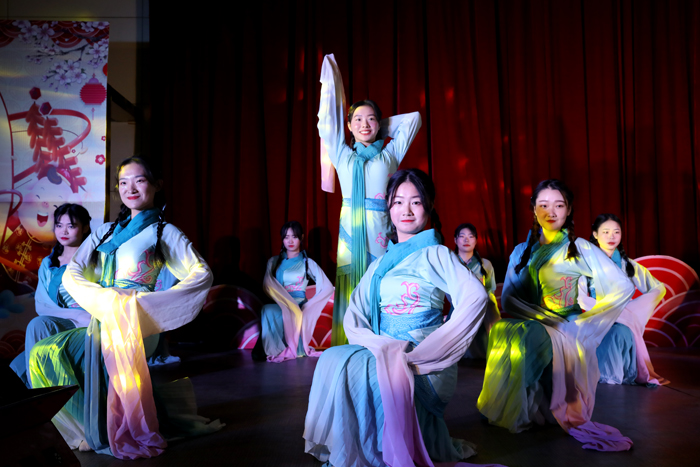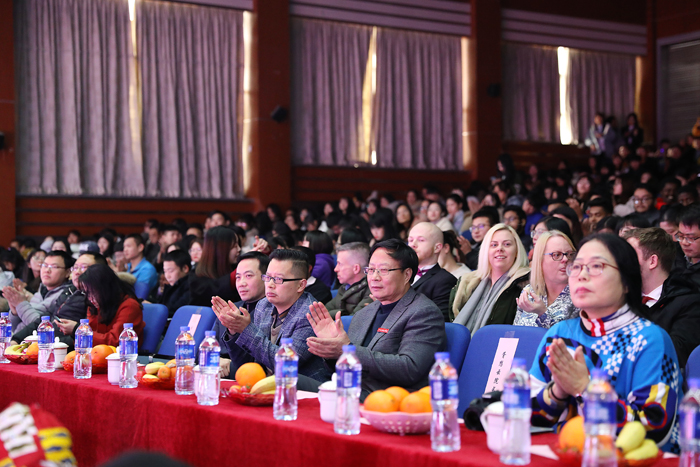 汇演共分为“朝花夕拾”、“同爱而行”、“筑梦青春”三个篇章。歌舞《We are all in this together 》、孟加拉舞蹈、歌舞《感恩的心》、舞蹈《蓝色降落伞》和《咏春》、歌曲《Imagine all the people》……由外语外贸(国际教育)学院中外师生带来的精彩节目博得观众们喝彩连连。现场师生还通过游戏“击鼓传‘猪’”表达对学校的感恩和祝福。