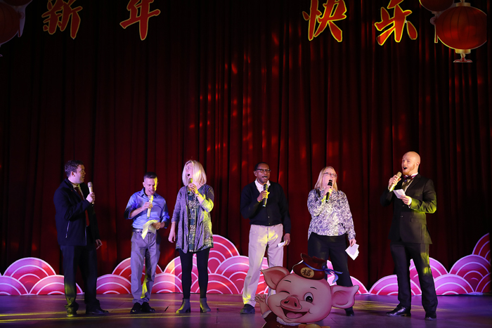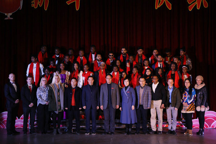 仪式结束后,外语外贸(国际教育)学院举办了2019年“星衍梦聚,光熠青春”迎新年文艺汇演。陈石俊与部分职能部门负责人、该学院师生代表共计800余人一道观看了演出。
