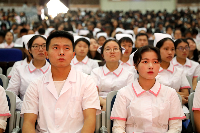 开学典礼上,在音乐舞蹈学院张淑芳同学的指挥下,全体起立奏唱《国际歌》。文化与传媒学院姚昕锦代表全体学员发言。外贸外贸(国际教育)学院王铎带领全体学员宣誓。