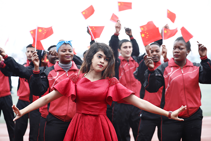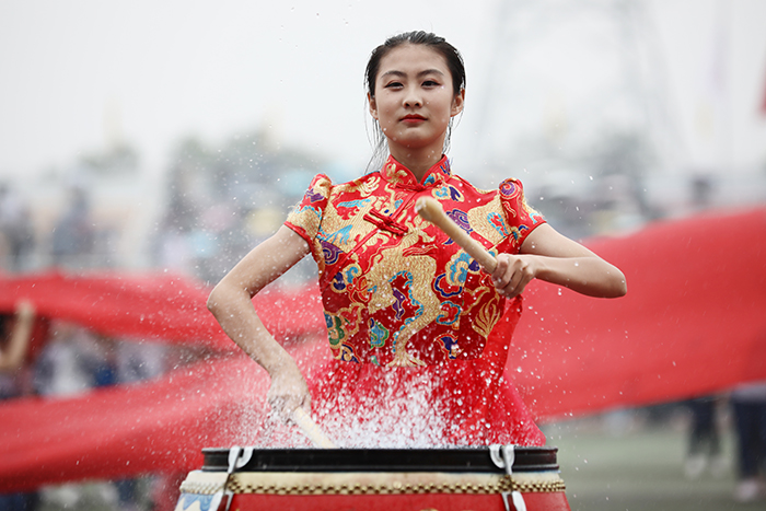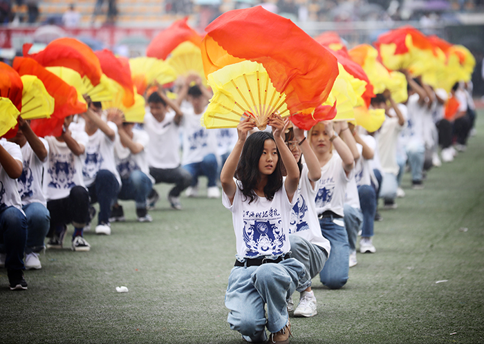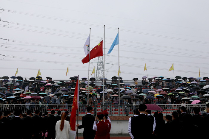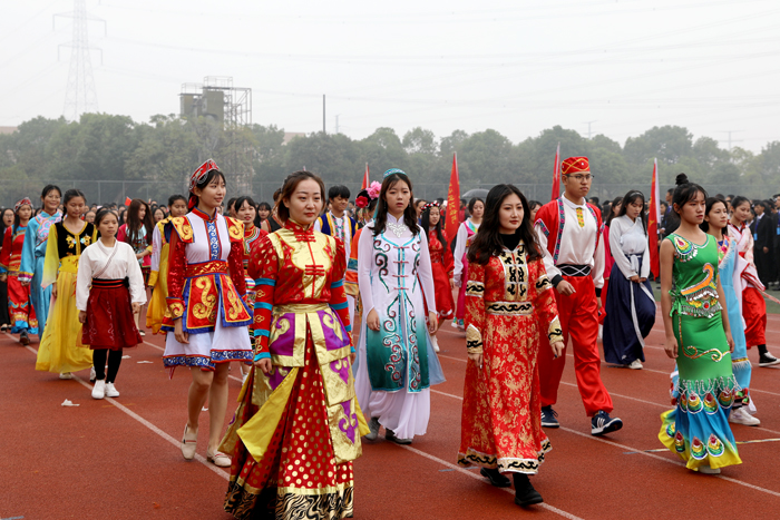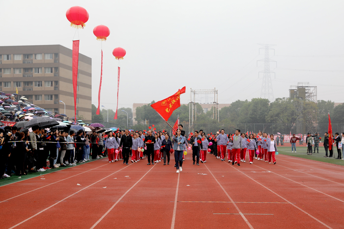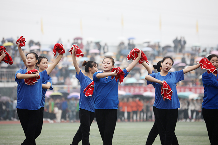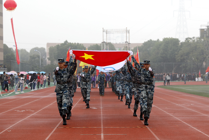在庄严的升旗仪式后,举行了运动员入场式。伴随着激扬嘹亮的《运动员进行曲》,裁判员、运动员队伍依次入场。尽管天空下着雨,但他们踏着稳健的步伐,神采奕奕、昂首阔步从主席台前经过。各学院代表队各具特色,运动员有的穿着整齐的制服,有的穿着鲜艳的运动服,有的穿着靓丽的民族服装,还有留学生精彩的舞蹈表演,让人应接不暇,充分展现出我校师生的奋发向上的精神风貌。