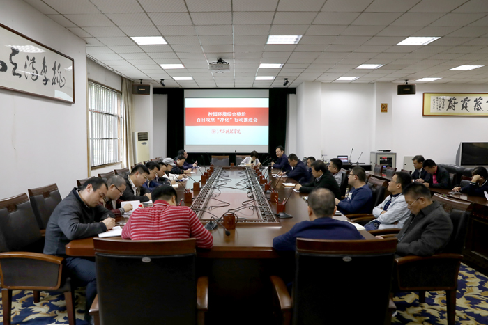 江科网讯(记者 何强江)10月23日下午,校园环境综合整治百日攻坚“净化”行动推进会在行政北一楼会议室召开。黄辉玲副校长出席并作讲话。会议由总务处处长郑苏生主持。