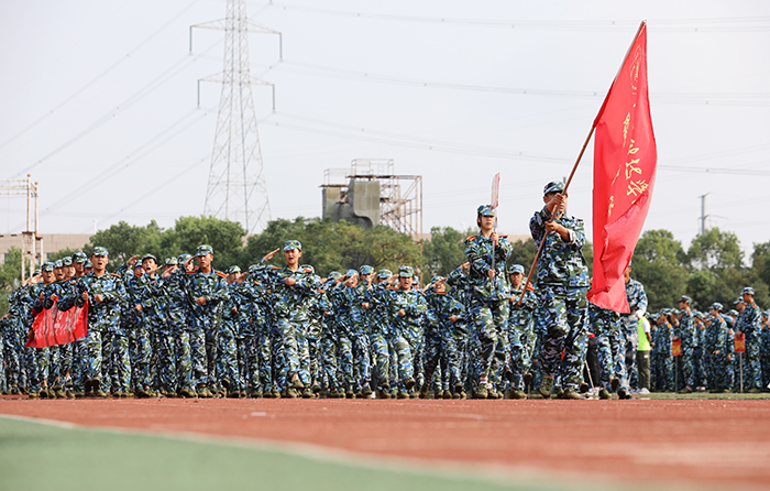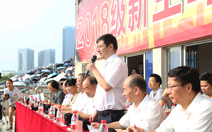 王海在仪式上发表讲话。他代表学校向来自祖国各地的新同学表示热烈的欢迎,向为军训成功付出艰辛努力的教官和工作人员表示感谢,向辛勤耕耘在教学第一线的老师致以诚挚的问候。他寄语广大新生,进入大学以后要尊师重教,主动学习,培养创新意识、提升创新能力,加强锻炼。他说,大学是人生新的起点,同学们要拿出青春的热情和勇气,为命运而博,为前途而战,为实现伟大的中国梦而奋发读书,不懈奋斗!他希望同学们以于果董事长为榜样,努力践行校训、校风,敢于突破,自我超越,志在千里,创造伟业。他嘱托大家,谨记成才不能浪费一点时间,主动学习,学会学习;要树立强烈的创新意识,掌握科学的创新方法,积极参与创新实践,努力取得创新成果;要树立远大的理想和抱负,认真学习习近平新时代中国特色社会主义思想,高举实现伟大的中国梦的旗帜,争做优秀的社会主义事业的建设者和接班人。最后,他希望同学们拿出舍我其谁的气魄,拿出天生我才必有用的信心,拿出吹尽黄沙始到金的毅力,去迎接新的学习生活,去迎接更有成就的锻炼,去拥抱明天的太阳,去创造辉煌的未来!