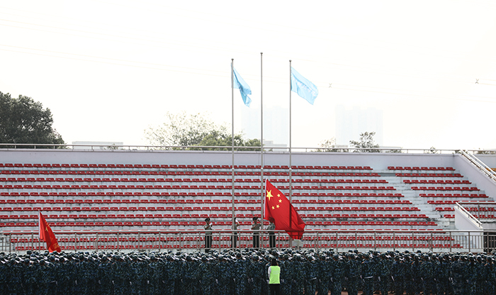 8时30分,庄严的国歌声中,五星红旗冉冉升起。随后,于果宣布检阅开始。