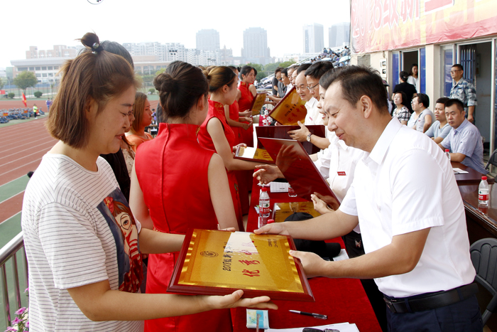 万哨凯宣读了学校对军训先进集体和个人的表彰决定。校领导向受表彰的集体和个人代表颁奖。