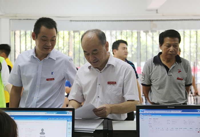 当天上午,校长王海,校党委副书记肖イ毛根,副校长林素君、周万华、黄辉玲、万哨凯在相关职能部门负责人的陪同下深入迎新工作一线巡视。在各学院迎新接待点、学生活动中心、后勤中心等地,王海等人听取了新生报到情况汇报,并亲切慰问参与迎新的老师和同学。