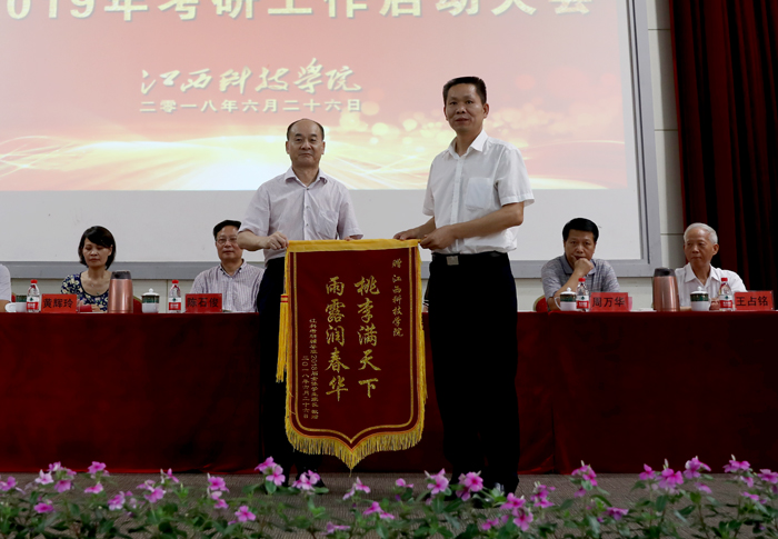 会上首映了我校2018年考研工作纪实片《研路》,考研之星家长代表向学校敬赠印有“桃李满天下,雨露润春华”的锦旗表达感激之情。