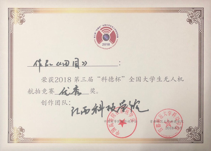 江科网讯(通讯员 刘玉祥)近日,第三届“科德杯”全国大学生无人机航拍竞赛在首都师范大学科德学院圆满落幕,大赛吸引了国内外近200所高校的260支代表队的810余名选手携近300架无人机参加。经过激烈角逐,最终,我校文化与传媒学院学生孙磊、罗俊龙、余嘉浩、孙飞、朱宽波等同学共同创作的作品《田园》(指导老师:刘玉祥)荣获优秀奖。