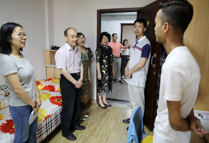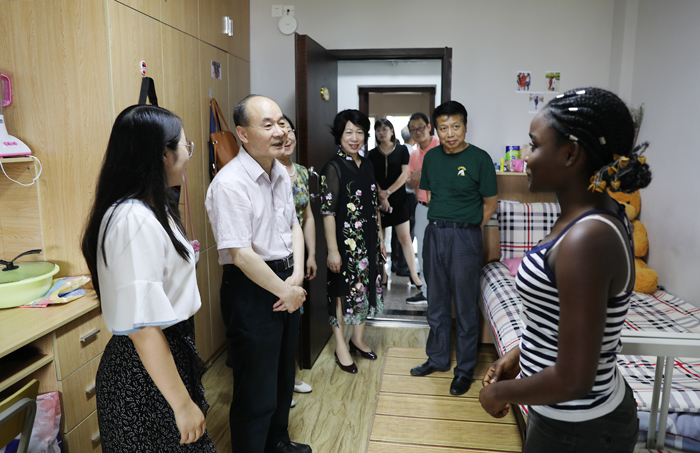 随后,校领导们走访了外国留学生宿舍,向宿管员仔细询问了留学生们饮食和住宿等方面的情况。