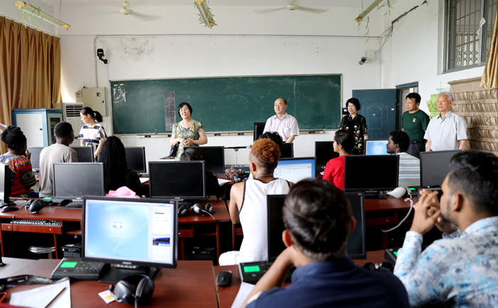 校长王海,党委副书记肖イ毛根,副校长陈石俊、张海涛、林素君、周万华,总督学王占铭一行在外语外贸(国际教育)学院院长胥懋云、副院长郭留松等人的陪同下,走进了外国留学生上课的教室。在教室,王海和留学生们亲切交谈,询问他们的学习和生活情况。他还寄语留学生们,要努力学习,积极锻炼身体,遵守学校的规章制度,团结友爱,圆满完成学业,成为各个国家的栋梁。