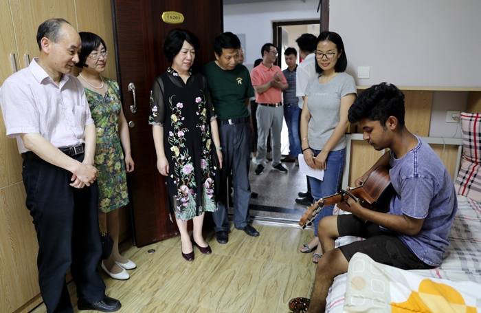走访过程中,校领导们每到一个房间,都受到同学们的热烈欢迎。留学生们有的主动给校领导们介绍自己国家的风俗习惯,有的表演才艺,整个过程充满欢声笑语。王海向留学生们表达了校领导们的关心,并鼓励大家要好好学习,学有所获、学有所成。