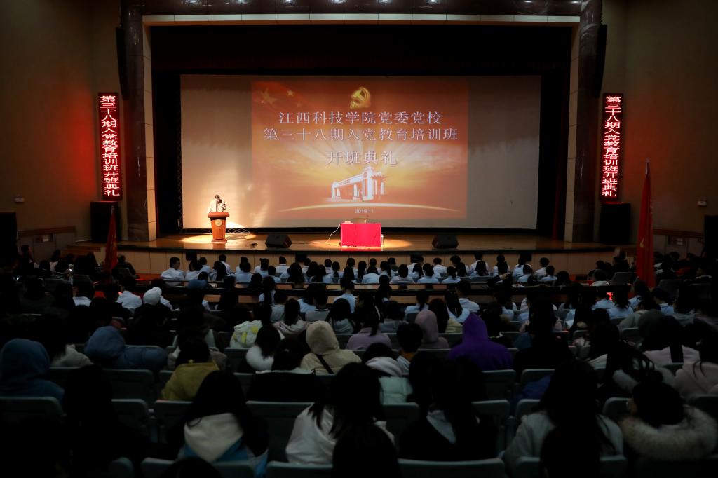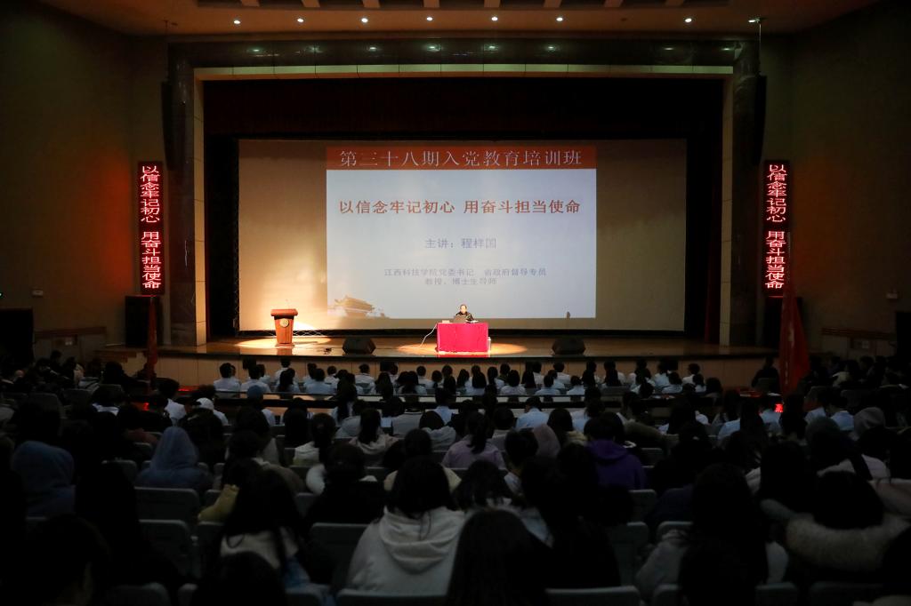 江科网讯(记者 何强江)11月29日下午,江西科技学院党委党校第三十八期入党教育培训班开班典礼在蓝海大剧场隆重举行。校党委书记、督导专员程样国教授以“以信念牢记初心 用奋斗担当使命”为主题,为1400余名培训班学员代表授课。典礼由党委委员、纪委书记、组织部部长夏拥华主持。