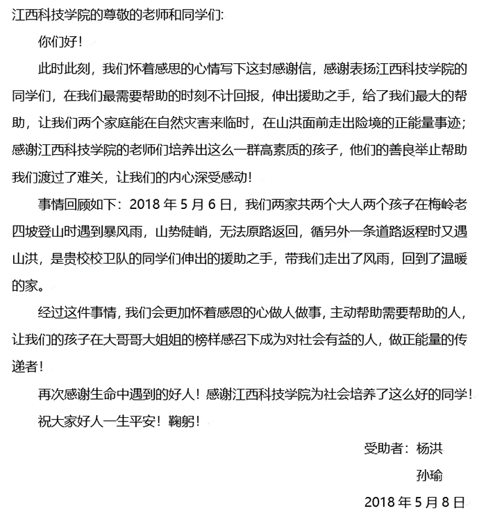 江科网讯(记者 李倩)5月8日下午,江西科技学院迎来三位特殊的客人——两位和蔼可亲的母亲和一位天真烂漫的小姑娘。三人手捧着开得正灿烂的向日葵,拿着一封暖意融融的感谢信,匆匆走进学校会议室,与她们苦苦寻找了两天的十一位大学生重逢了。走在最前头的母亲,名叫孙瑜,来自江西省血液中心。这场让人倍感暖心的重逢,是她委托学校安排的,希望当面感谢5月6日给予他们帮助的十一位江科学子:信息工程学院的蔡志强、罗文静、凌振华、姜标、易爱成、钟懿、徐智敏,财经学院的罗能昌,服装学院的杨桐,文化与传媒学院的张静文、莫子聪,他们同时也是学校校卫队的队员。