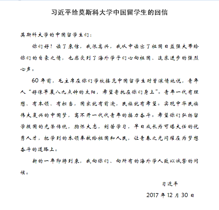 1957年,毛泽东同志在莫斯科大学接见中国留学生时,发表了“希望寄托在你们身上”的著名讲话。近日,莫斯科大学的中国留学生给习近平总书记写信,汇报了结合毛主席当年讲话学习党的十九大精神的体会,表达了追求进步、报国为民的决心。