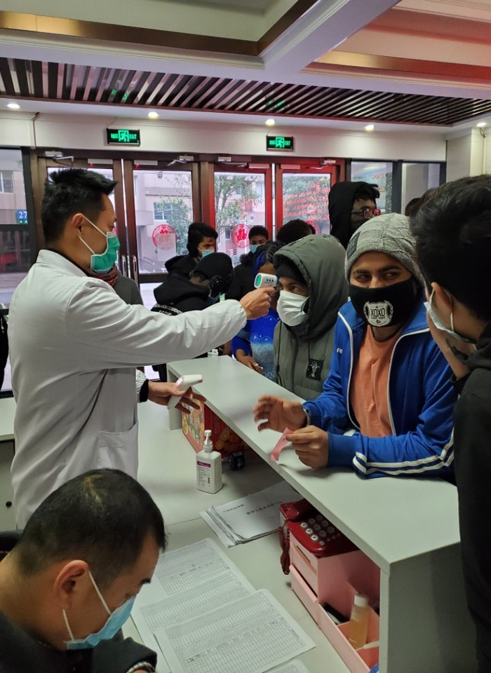 为保障在校留学生的健康,每天下午庄义泉都前往留学生楼对在校留学生进行健康巡查,挨个询问学生的身体状况、监测体温。医务所防控物资储备严重不足,庄义泉将口罩及时分配给留学生、在校值班的保卫、水电宿管工作人员,自己则选择在忙碌一天后,将口罩帽子用紫外线消毒后反复使用2到3天。庄义泉所做的一切,都践行着党员的初心和使命。