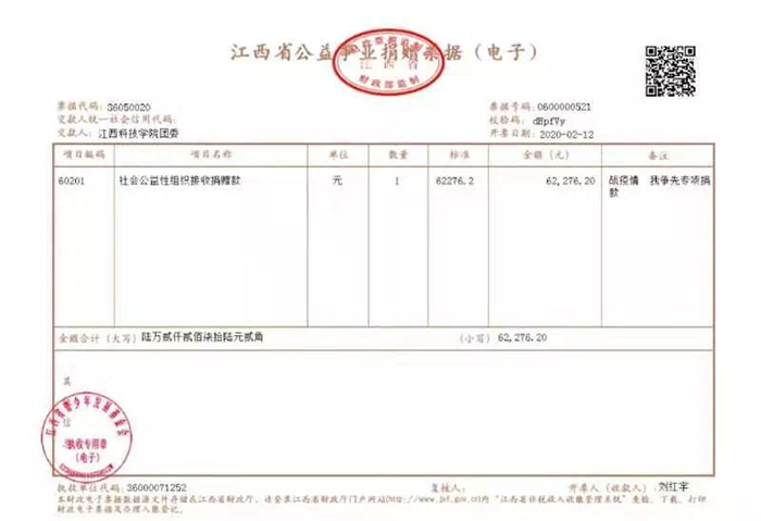 截止2月12日,校团委共计收到爱心捐助善款62276.2元(不包括前期部分团组织已经转至江西省红十字会、武汉市慈善总会等善款),这笔爱心捐款已全部转至江西省青少年发展基金会,用于抗疫防疫。