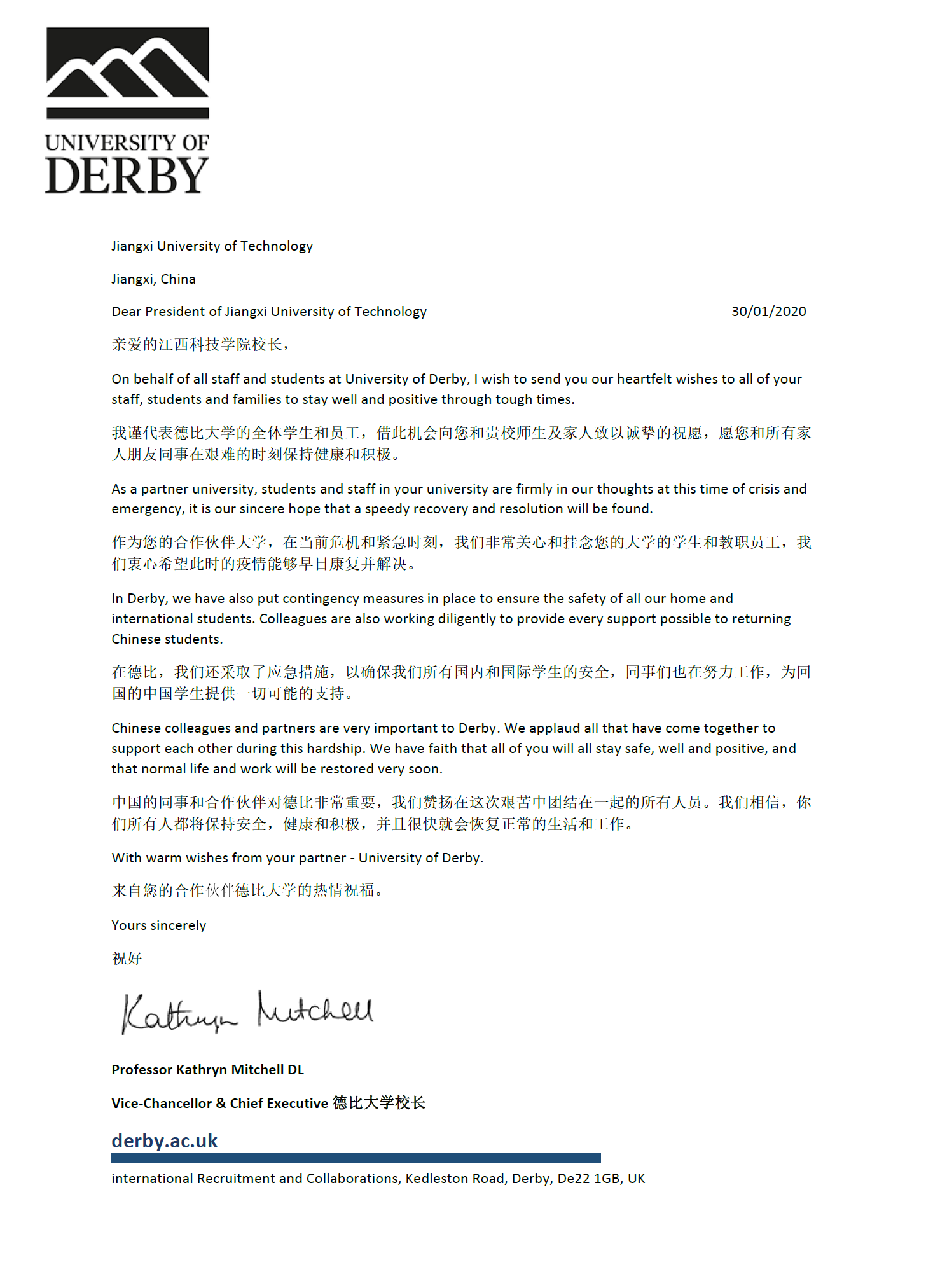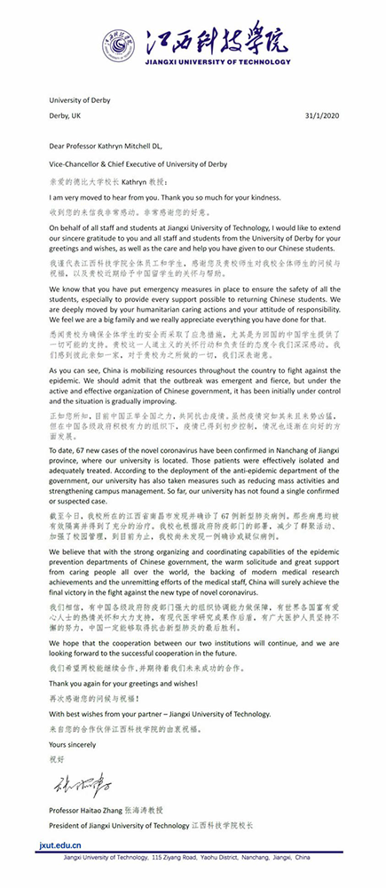 Kathryn在信中表示,德比大学作为我校合作伙伴大学,在当前危机和紧急时刻非常关心和挂念我校学生和教职员工,衷心希望疫情能够早日结束。针对新冠肺炎疫情,德比大学采取了应急措施,以确保国内和国际学生的安全。学校教职员工努力为回国的中国学生提供一切可能的支持。Kathryn对在这场艰苦的抗疫阻击战中团结在一起的所有人员表示敬意,并坚信疫情即将过去,大家很快就会恢复正常的生活和工作。