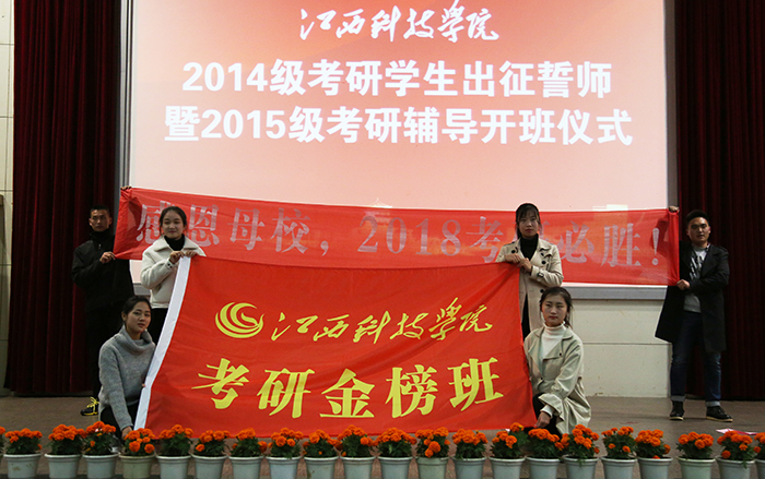 江科网讯(记者 李倩 通讯员 余美剑)11月20日下午,我校2014级考研学生出征誓师暨2015级考研辅导开班仪式在学术报告厅A厅隆重举行。校长王海,副校长胡剑锋、黄辉玲和张海涛出席。大会由胡剑锋主持。