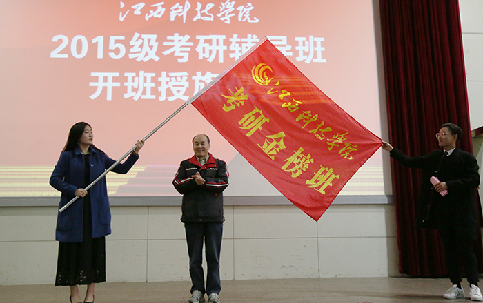 仪式上,王海为2015级考研辅导班授旗。