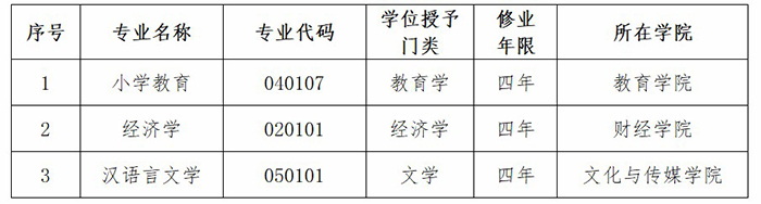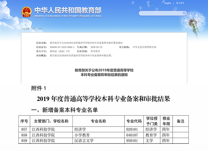 江科网讯(来源:教务处)近日,教育部下发了《关于公布2019年度普通高等学校本科专业备案和审批结果的通知》(教高函 [2020]2号),我校申报的小学教育、经济学、汉语言文学等3个本科专业,通过教育厅、教育部等审核程序并顺利获批,新增专业可自2020年起开始招生。目前,我校本科专业涵盖工学、管理学、艺术学等八个学科门类,学科专业布局进一步优化。具体获批本科专业如下表: