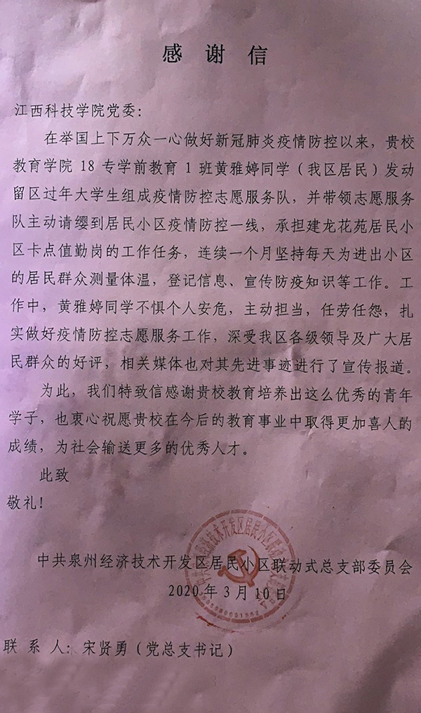 江科网讯(记者 李倩)日前,校党委收到一封特殊的感谢信。福建泉州经济技术开发区居民小区联动式总支部委员会专门来信感谢连续一个月坚持在社区一线开展志愿服务的我校学子黄雅婷。