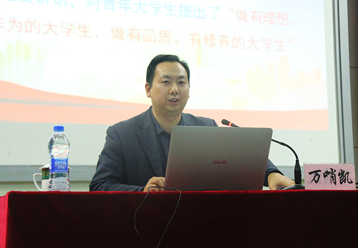 万哨凯为此次团支部活力提升培训班授旗并作了题为《如何做一名优秀的学生干部》专题讲座。他围绕学生干部是什么、有什么、做什么三个方面进行了详细阐述。他指出,学生干部首先是学生,其次是干部,最后是学生干部。学生干部需要具备的三个意识(公仆意识、民主意识、创新意识),四项综合素质(政治思想素质、业务素质、能力素质、心理素质),五种能力(沟通能力、组织能力、协调能力、决策能力、创新能力)。他还谈到,作为一名优秀的学生干部要具备四勤,即“腿勤、手勤、脚勤、脑勤”;要发挥好四个作用,即模范带头、桥梁纽带、助手表率、组织凝聚。他强调,全校团员青年要认真学习贯彻党的十九大精神,认真履行一名团员青年的职责和义务,勤奋学习,踏实工作,为学校共青团事业的发展贡献青春和智慧。