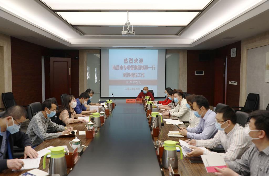 江科网讯(记者 李倩)4月28日下午,由南昌市疾控中心徐丹、汪德华,市教育局杨颐琴,高新区管委会公共卫生中心熊华宏、黄明星组成的南昌市专项督查组一行来校督查学校2020年春季学期返校学习准备工作。党委副书记、副校长黄辉玲接待了督查组一行。