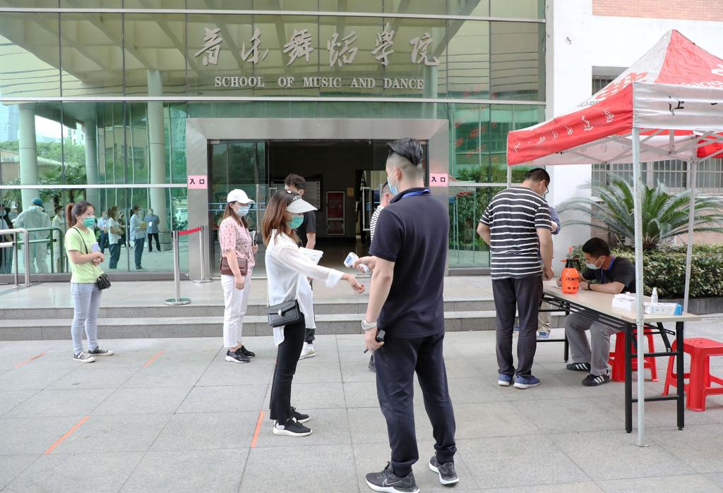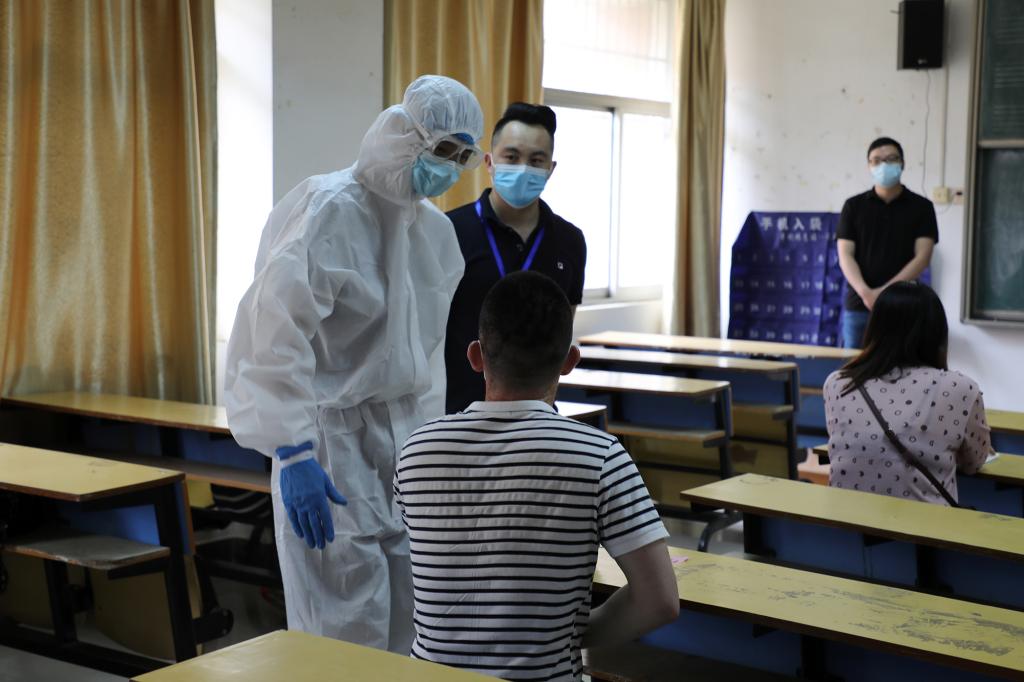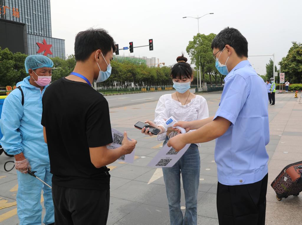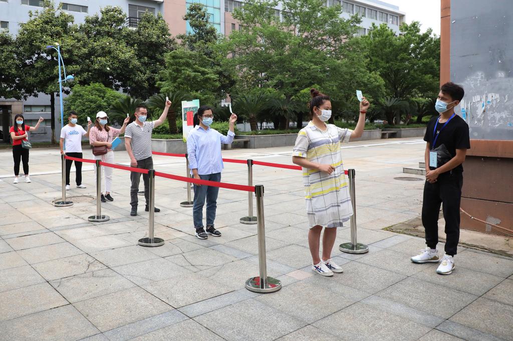 本次演练针对学生返校、学生晨午检、学生进入宿舍、学生就餐及学生进入教室等五个重点环节,按照“演练即实战”的标准,模拟学生返校后防控疫情的真实场景。在学生入校演练环节,“学生”佩戴口罩、单人单向以1米以上间隔排队依次进入报到通道,按照“一核二测三查四扫五通过”( “一核”即核对身份信息、返校信息<是否为同意返校>,“二测”即测体温,“三查”即查验“健康码”,“四扫”即返校扫码登记,“五通过”即通过检查与检测)的要求进入学校。在学生宿舍演练现场,“学生”有序经宿管员测温消毒后进入宿舍。在学生就餐演练环节实行错峰就餐,“学生”在餐厅门口洗手消毒测温后有序排队进入餐厅点餐、取餐,堂食者要求单人单桌单向就座。在教室上课演练环节,“学生”在教学楼入口进行体温检测后进入教学楼,进入教室后,“学生”们分散就坐。在入校、入宿舍、入食堂、入教室过程中,只要发现体温异常的“学生”,学校便立即启动应急处置机制,依次采取医务人员研判、场所消毒等措施。