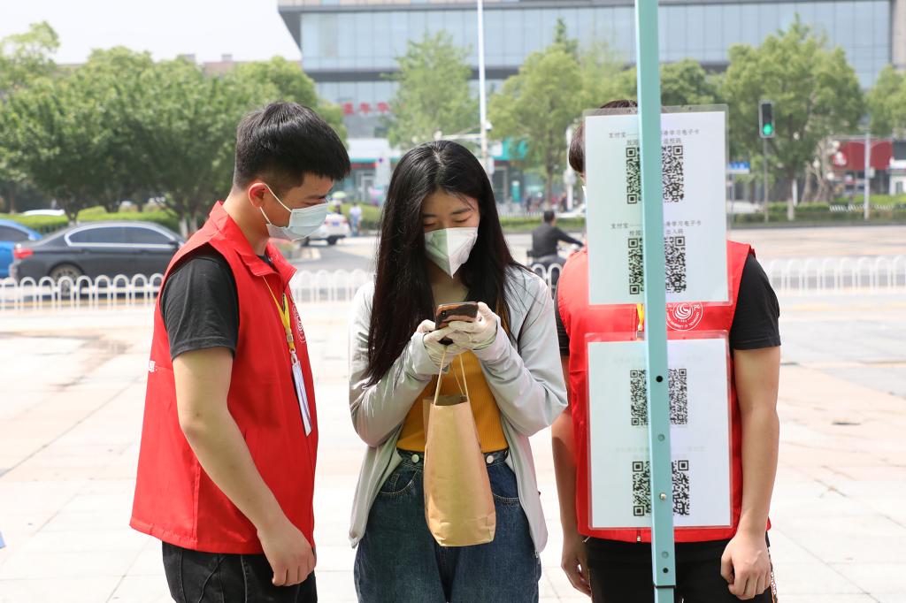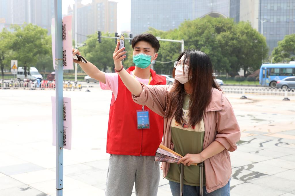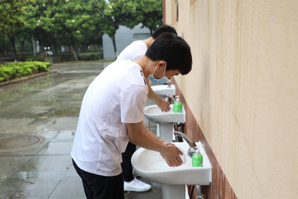 相关学院、校团委、学工处、总务处、保卫处等教职工和学生辅导员在学校南大门现场引导学生扫码、核对身份信息、测量体温、查验个人健康码等。全部通过后,由小黄车免费送到宿舍楼。在宿舍楼,返校的同学需再次经过亮码、测温、登记后进入寝室。在学生食堂,同学们佩戴口罩、自带餐具,经过洗手、测温后间隔1米以上排队取餐,堂食者单人单向单座用餐。