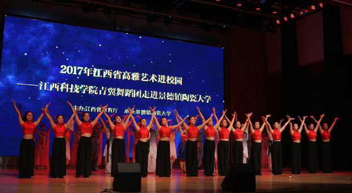 江科网讯(记者 李倩)我校舞蹈团作为今年入选2017江西省高雅艺术进校园的高校十大院团之一,携精心打造的原创舞蹈作品于近日分别赴景德镇陶瓷大学,景德镇学院,江西陶瓷工业美术职业技术学院和江西科技师范大学4所高校进行巡演。本次高雅艺术进校园巡演活动由党委书记程样国、副书记肖イ毛根带队。