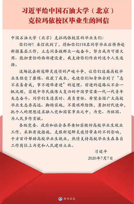 “同学们生逢其时、肩负重任。希望全国广大高校毕业生志存高远、脚踏实地,不畏艰难险阻,勇担时代使命,把个人的理想追求融入党和国家事业之中,为党、为祖国、为人民多作贡献。”7月7日,习近平总书记给中国石油大学(北京)克拉玛依校区毕业生回信,肯定他们到边疆基层工作的选择,并对广大高校毕业生提出殷切期望。我校师生认真学习并热议回信精神,纷纷表示,要牢记总书记的殷殷嘱托,志存高远、脚踏实地,勇敢肩负起时代使命,在各自的岗位上作出应有贡献。