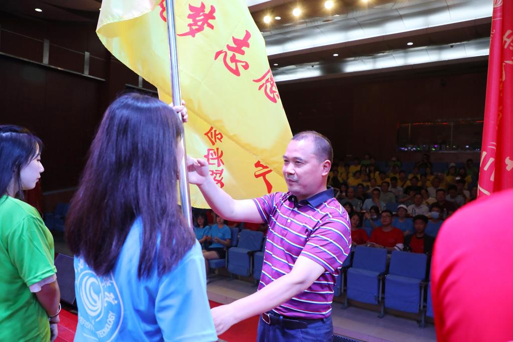 闵桂林为2020年大学生暑期“三下乡”队伍和防汛抗洪青年突击队授旗并讲话。他向即将奔赴各地参加暑期“三下乡”的师生强调了实践导向、学科导向、问题导向和成果导向等四个“导向”,提出了三点希望,即希望大家在实践中精准把握时代发展脉络,切实发扬“自信、自强、创业、创新”的江科精神;深入了解乡村基层发展现状,积极投身乡村振兴战略实施;牢固树立安全意识,有效防范各类安全风险。他希望师生以强大的精神力量和强劲的实践动能,为实现中华民族伟大复兴的中国梦贡献青春力量。