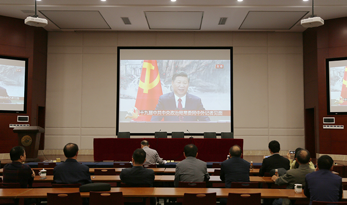 江科网讯(记者 李倩)25日上午11时55分左右,人民大会堂东大厅,新一届中央政治局常委同采访十九大的中外记者见面。十九届一中全会选举产生的新一届中央政治局常委是:习近平、李克强、栗战书、汪洋、王沪宁、赵乐际、韩正。董事长于果,校党委书记程样国,校长王海等在家校领导、校党委委员在行政楼南一楼第一会议室集体收看了见面会直播。