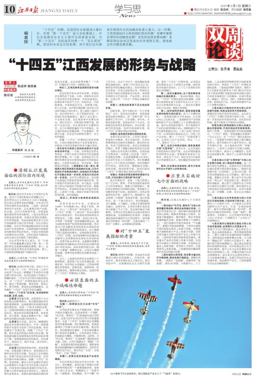 近日,副校长陈石俊接受《江西日报》“双周论谈”专访。8月5日,《江西日报》学与思专版发表了《“十四五”江西发展的形势与战略》文章。全文如下: