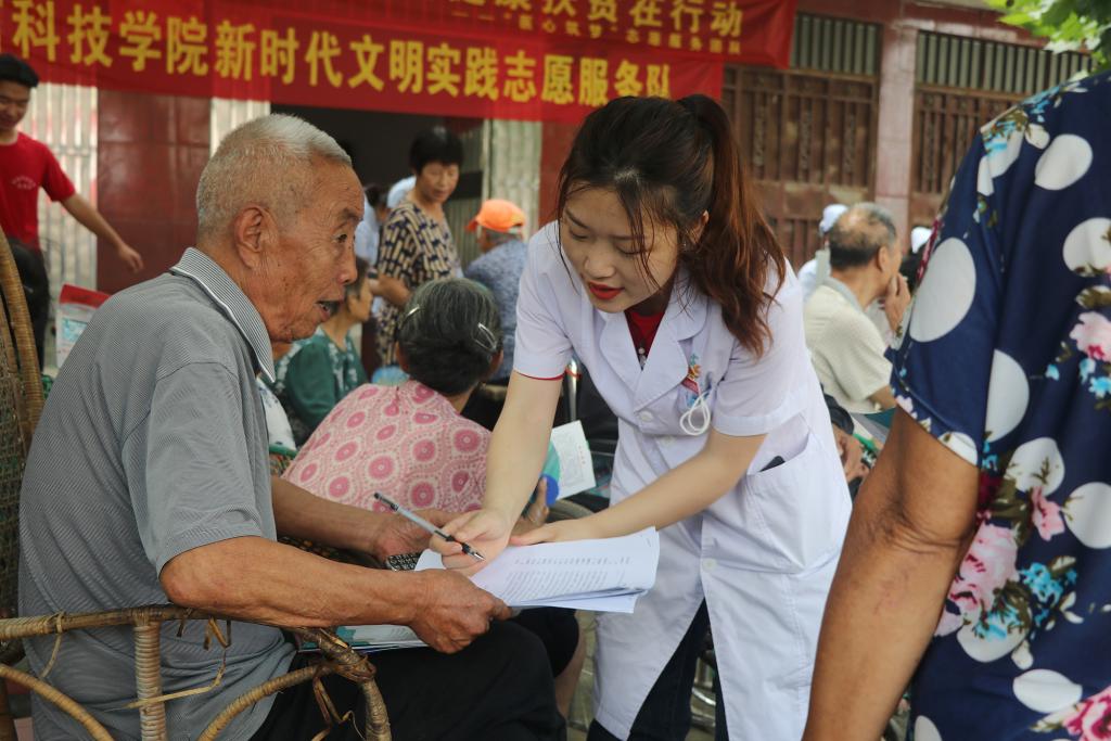 江科网讯(记者 何强江)“老爷爷,您的血压和血糖都有点高,平时生活中要注意饮食及行动安全。”在景德镇市浮梁县寿安镇柳溪村老年驿站,江西科技学院医学院“医心筑梦”医疗服务团队的新时代文明实践志愿者们,耐心细致地用通俗易懂的语言为村民们解答健康方面的问题。