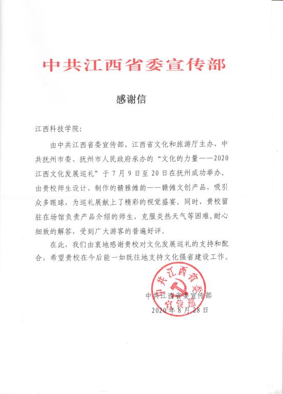 江科网讯(记者 陈佩璇)日前,中共江西省委宣传部给我校发来感谢信,感谢我校对2020江西文化发展巡礼的支持和配合,希望我校在今后能一如既往地支持文化强省建设工作。